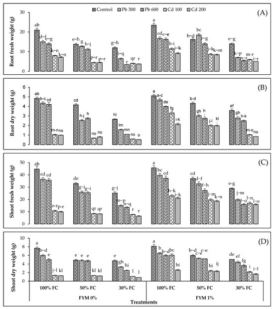 Effects of farmyard manure and drought on root fresh weight (A), root dry weight (B), shoot fresh weight (C) and shoot dry weight (D) of ryegrass in Pb- and Cd-contaminated soil. The standard errors and means of four replicates are represented by the error bars and columns, respectively, and different small letters on columns show the statistical difference (i.e., significance and/or non-significance) among different means (p ≤ 0.05). FC, field capacity; Pb, lead; Cd, cadmium.