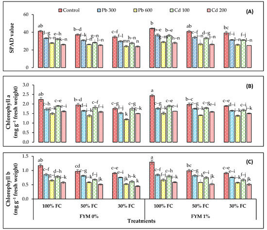 Effects of farmyard manure and drought on SPAD value (A), Chl a (B), and Chl b (C) in Pb- and Cd-contaminated soil. The standard errors and means of four replicates are represented by the error bars and columns, respectively, and different small letters on columns show the statistical difference (i.e., significance and/or non-significance) among different means (p ≤ 0.05). FC, field capacity; Pb, lead; Cd, cadmium.
