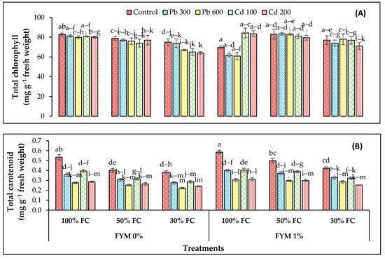 Effects of farmyard manure and drought on total chlorophyll contents (A) and total carotenoid contents (B) in Pb- and Cd-contaminated soil. The standard errors and means of four replicates are represented by the error bars and columns, respectively, and different small letters on columns show the statistical difference (i.e., significance and/or non-significance) among different means (p ≤ 0.05). FC, field capacity; Pb, lead; Cd, cadmium.
