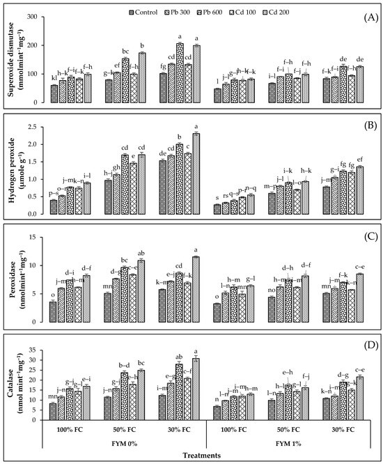 The addition of FYM in the uncontaminated treatment showed a decrease of up to 32.7% in antioxidant activities over the un-amended and uncontaminated controls at 100% FC (Figure 5). The application of FYM (1%) also decreased the antioxidative attributes of ryegrass by up to 29.3%, 46.7%, 35.2%, and 38.5% in the presence of 300 mg kg−1 Pb, 600 mg kg−1 Pb, 100 mg kg−1 Cd, and 200 mg kg−1 Cd, respectively, as compared to un-amended contaminated controls. Similarly, decreases of up to 38.4% (50% FC) and 49.0% (30% FC) in antioxidant attributes were also observed as compared to their respective un-amended controls. Moreover, at 50% FC and 1% FYM, significant decreases of up to 29.3%, 46.7%, 52.2%, and 44.9% were monitored with 300 mg kg−1 Pb, 600 mg kg−1 Pb, 100 mg kg−1 Cd, and 200 mg kg−1 Cd, respectively. Likewise, a similar trend was seen under treatments containing FYM at 30% FC. The addition of FYM in treatments at 30% FC revealed decreases of up to 37.3% and 38.5% at 300 and 600 mg kg−1 Pb, respectively, over their respective controls (without FYM at 30% FC). Similarly, the addition of FYM under Cd contamination of 100 and 200 mg kg−1 Cd showed decreases of up to 31.1% and 41.2%, respectively, in physiological attributes as compared to contaminated control (without FYM at 30% FC) (Figure 5).