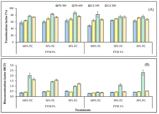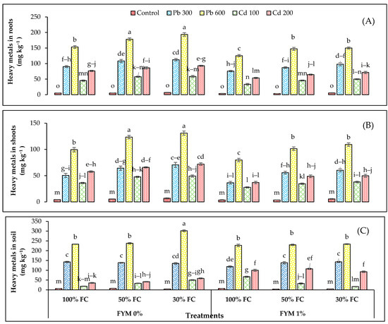 The application of FYM (1%) to soil resulted in accumulations of 36.4 mg kg−1, 79.7 mg kg−1, 27.7 mg kg−1, and 36.8 mg kg−1 of Pb in shoots and 75.5 mg kg−1, 125 mg kg−1, 33.3 mg kg−1, and 53.7 mg kg−1 of Pb in roots in the presence of 300 mg kg−1 Pb, 600 mg kg−1 Pb, 100 mg kg−1 Cd, and 200 mg kg−1 Cd, respectively. Moreover, in the presence of 300 mg kg−1 Pb at 50% FC and with 1% FYM, the plants accumulated 55.6 mg kg−1 and 87.1 mg kg−1 of Pb in the shoots and roots of ryegrass, respectively. Similarly, at 600 mg kg−1 of Pb contamination, the plant shoots and roots accumulated 101 mg kg−1 and 147 mg kg−1, respectively. A similar trend was observed in the case of Cd contamination, where plants accumulated around 80 mg kg−1 and 112 mg kg−1 of Cd when subjected to 100 mg kg−1 Cd and 200 mg kg−1 Cd, respectively, at 50% FC (Figure 6). With the addition of FYM in treatments at 30% FC, the results revealed 60.2 mg kg−1 and 109 mg kg−1 (in shoots) and 97.9 mg kg−1 and 150 mg kg−1 (in roots) at 300 mg kg−1 and 600 mg kg−1 Pb, respectively, and in the presence of Cd, 37.9 mg kg−1 and 49.7 mg kg−1 Cd accumulation in shoots and 49.9 mg kg−1 and 71.4 mg kg−1 Cd in roots at 100 mg kg−1 and 200 mg kg−1 Cd, respectively, was observed (Figure 6). Overall, higher amounts of both HMs were accumulated in roots than shoots.