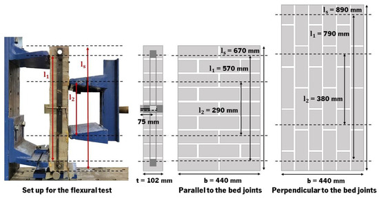 With regard to flexural strength, the masonry specimens were tested in both directions (‘parallel’, referring to parallel to the bed joints, and ‘perpendicular’, referring to perpendicular to the bed joints) according to the recommendations of EN 1052-2 [43] (Figure 2). To conduct the tests, a 300 kN hydraulic actuator was used with displacement control at a rate of 3 µm/s. In both parallel and perpendicular cases, 2 LVDTs set up on either side of each specimen were used to measure the out-of-plane deformation. In the case of the parallel layout, the single-leaf specimens had 9 courses of bricks, with 2 bricks in each course. The size of each sample was measured as 670 mm in height and 440 mm in width (refer to Figure 2). EN 1052-2 [43] outlines the recommended dimensions of the length of a specimen in the direction of the span (ls), the spacing between supports (l1), and the distance between inner bearings (l2) for the proper application of a load. The values adopted for this case were ls = 670 mm, l1 = 570 mm, and l2 = 290 mm. For the perpendicular case, while the specimens were also single-leaf specimens, they featured 6 courses of bricks, with 4 bricks in each course. The dimensions of each sample were 890 mm in height and 440 mm in width (Figure 2). In this case, ls corresponded to 890 mm, while l1 and l2 were 790 mm and 380 mm, respectively.