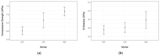 The results of testing the masonry wallets with different types of mortars with regard to compressive strengths and E-moduli can be seen in Table 5 and Figure 4, along with the corresponding error bars. Amongst all the masonry mortars, Ref has the highest compressive strength. This is followed by L50 and then L67. The masonry strength was seen to increase with the strength of the mortars (Ref, L50, and L67). According to EN 1052-1 [80], the characteristic values of compressive strength were estimated by taking the mean compressive strength of masonry and dividing it by a factor of 1.2. The E-modulus-to-compressive-strength ratio was between 600 and 650 for the average value of strength and 725 to 775 for the characteristic value. There was no significant trend to observe in this regard.