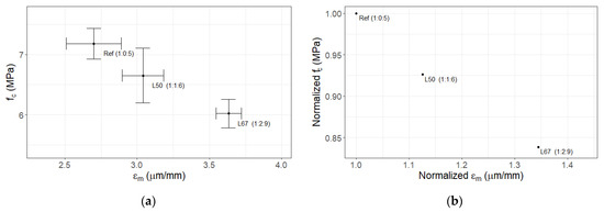 As shown in Figure 5, the vertical strain associated with the highest compressive strength of masonry wallets was compared with the actual maximum compressive stress. The figure illustrates absolute (Figure 5a) and relative (Figure 5b) values that have been normalized with regard to the maximum deformation/vertical strain of the reference mix, as well as the associated error bars. When it comes to a comparison with Ref, L50 typically showcases 7.4% lower strength and 13.7% more strain. L67 has 16.2% less strength compared with Ref and 33.7% more strain. The strength of L67 is also 9.5% lower and its strain is 17.6% higher than that of L50. All these values depict that with every 1% reduction in the masonry wallet’s strength, the strain at its highest point appears to increase by approximately 2%.