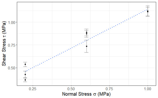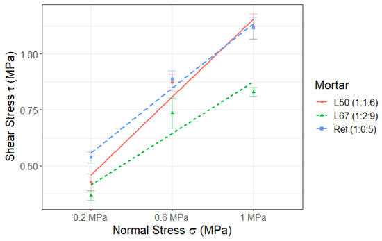 To determine the values of parameters like the coefficient of friction and cohesion, the normal stress (or vertical pre-compression) was plotted against the shear stress for different mortar types (as illustrated in Figure 6). Moreover, to make sure the Mohr–Coulomb criterion could be implemented, it was necessary to validate the linear relationship between the normal force and shear stress for each type of mortar. Linear regressions were carried out on the data and yielded R2 values of 0.99, 0.97, and 0.90 for the Ref, L50, and L67 mortars, respectively, thus validating the use of the Mohr–Coulomb equation. Table 10 outlines the values of different parameters with respect to each type of mortar. It presents tan(Φ) as the coefficient of friction, c is the cohesion or initial shear stress, τ represents the shear stress, and σ denotes the normal stress or vertical pre-compression.