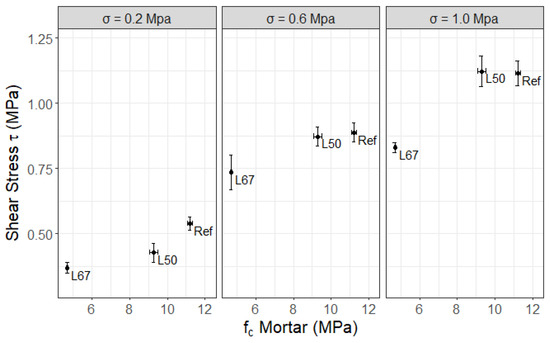 Previous research indicates that characteristics of bricks such as surface roughness, absorption rate, and mechanical strength might also have a direct effect on the cohesion and internal friction values apart from the mortar type [51,54,83]. Thus, further experiments need to be conducted in order to fully understand these factors. Table 11 demonstrates that L50 shows a greater maximum shear stress capacity than the L67 mixture across all pre-compression levels. Concurrently, Ref displays higher readings compared with L50 at 0.2 and 0.6 MPa of pre-compression, with approximately the same results at 1 MPa. Considering that L50 has a higher strength at the mortar level in comparison with L67, whereas Ref exhibits a slightly better compressive strength than L50, this seems to suggest that the compressive strength of the mortar can influence the maximum shear bond stress in the masonry. A graphical representation of this is seen in Figure 7, which depicts the maximum shear stress of the masonry based on the compressive strength of the mortar used and its corresponding error bars. This relationship may be confirmed by the literature as well, in which a mortar with a higher compressive strength led to a higher shear bond strength in triplet specimens [16].