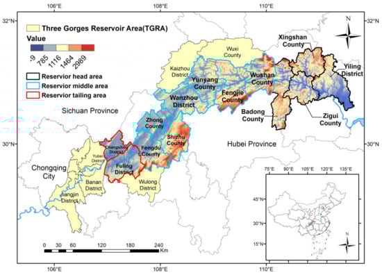 The TGRA is a unique geographical unit developed in the Yangtze River basin which resulted from the Three Gorges Project. It consists of 20 nations, cities, and districts in Hubei Province and Chongqing Municipality, covering an area of about 58,000 km2 [46]. The ecological environment in the region is sensitive and fragile, the contradiction between people and land is prominent, and the social and economic development is relatively lagging behind. In order to control and develop the Yangtze River basin, the construction of the Three Gorges Water Conservancy Project began in December 1994. Around October 2008, the offshore power station unit was put into operation, and the reservoir water level was 175 m [47]. In January 2010, the Three Gorges Project was completed and accepted after 16 years. After the completion of the project, the water level of the upper reaches of the Yangtze River basin increased by 113 m, involving the inundation of relocation counties in Yiling, Zigui, Xingshan, Badong, Wushan, Fengjie, Yunyang, Wanzhou, Zhong County, Shizhu, Fengdu, and Changshou, totaling 13 counties and districts in Chongqing Municipality, as well as the main urban area of Chongqing. A total of 1.31 million people were resettled and relocated with the intensification of human activities such as the construction of the Three Gorges Project and the urbanization and patterns of land use in the reservoir area changing significantly in stages, resulting in the decrease in the value of regional ecosystem services.