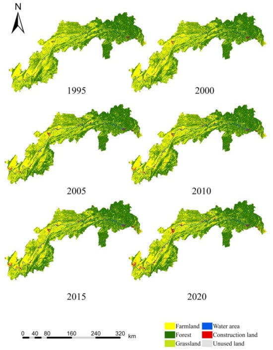 The influence of human socioeconomic activities on land use patterns is most visible in the rate of change and intensity of land use and direction of land conversion [17]. Farmland, forest, and grassland are the three principal land use types in the study region. The aggregate area of these three land types in the TGRA accounts for 96.48% of the urban areas along the Yangtze River. Forest has the highest share, accounting for more than 50% in five of the six periods and 49.84% in one, which is close to 50%. In terms of regional distribution, the research area’s forestland area exceeded 1.96 × 1010 m2, accounting for more than 45% of the total area across the 25-year period. Farmland covers more than 88% of the study area in the Chongqing portion and dominates the land use distribution in the Chongqing area, while forest dominates the land use distribution in the Hubei portion.