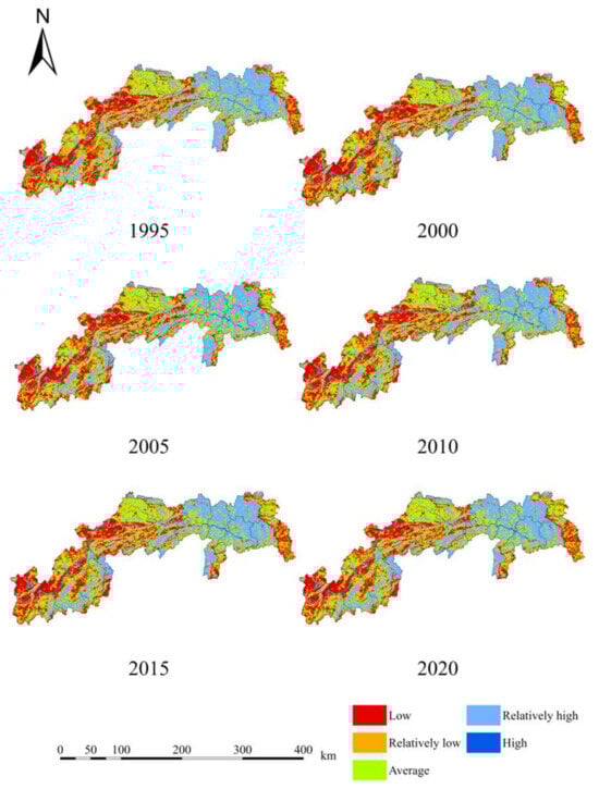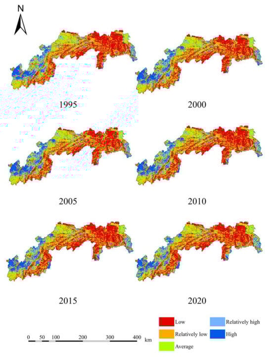 The research area in this study was small-scale towns, and a fine-scale unit of 1 km × 1 km was chosen for the spatial analysis of ecosystem service values. To classify the ESV into five levels for different time periods, the natural breakpoints method in GIS classification was used as the following: low (0–1.4 × CNY 106), relatively low (1.4 × 106 − 2.3 × CNY 106), average (2.3 × 106 − 3.2 × CNY 106), relatively high (3.2 × 106 − 5.1 × CNY 106), and high (above 5.1 × CNY 106). The spatial distribution maps of the per unit area ESV for the six time periods in the study area were generated using spatial analysis and visualization using GIS (Figure 3).
