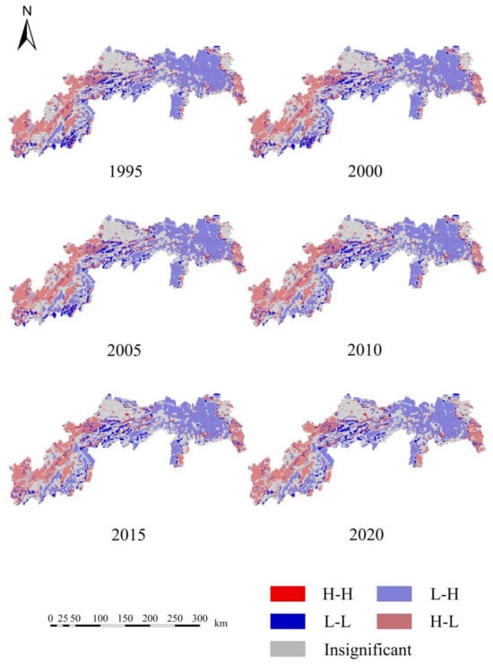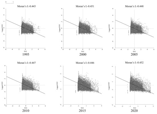 Figure 5 depicts the findings of a bivariate spatial autocorrelation model and scatter plot analysis of the unit grid’s per unit area ecosystem service value and HAI over six time periods. The indices of correlation between the two variables were computed. For 1995, 2000, 2005, 2010, 2015, and 2020, the bivariate spatial autocorrelation indices were −0.443, −0.451, −0.448, −0.447, −0.446, and −0.452, respectively. These indices show that the two variables had a reasonably substantial negative spatial association. Throughout the research period, the negative spatial relationship among them increased at first, then reduced, and then increased again.
