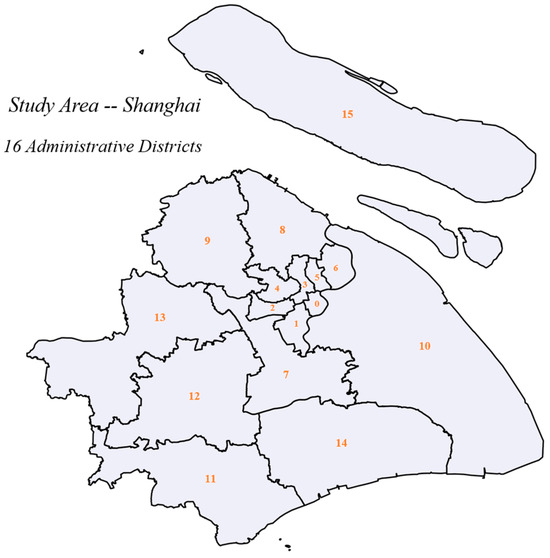 Shanghai is the national economic center and a megacity of China, with a population of over 24 million and an area of more than 6300 square kilometers. Shanghai has jurisdiction over 16 municipal districts, and its GDP ranks first among Chinese cities. However, Shanghai experienced a rapid outbreak of the COVID-19 pandemic since March 2022, leading to a great loss of production and life for its residents, and the government adopted the lockdown to contain the spread of the pandemic. As a result, we chose Shanghai as the study area to analyze the impacts of the pandemic and lockdown on online car-hailing travel. The numbers of 16 administrative districts in Shanghai are listed in Table 1, and the study area is shown in Figure 1.
