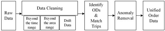 The procedure of data preprocessing in this study is shown in Figure 2. To begin with, we cleaned the raw data to exclude drift data and the data beyond the time or area range of our study. Afterward, we identified the ODs (origins and destinations) of trips from massive trajectory GPS data using the field of passenger state. The passenger state change from “off” to “on” means the passenger(s) is (are) picked up (which means the origin of the trip), and conversely indicates a drop-off point (destination). The online car-hailing trips were matched and saved. Additionally, several anomalies were observed. Ping-pong data, incomplete data, duplicate data, and records with travel times greater than 1 day and less than 1 min were removed. Finally, a unified order dataset was obtained as the basis for the following study, preserving concise information on the location and time of the origins and destinations.