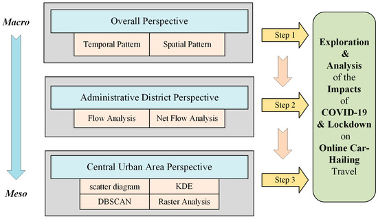 The COVID-19 pandemic and lockdown have caused serious impacts on people’s lives, especially on daily travel like online car-hailing. Understanding the impacts of the pandemic on online car-hailing travel is essential for sustainable urban planning and governance, especially during public health emergencies including COVID-19. However, few studies have delved into the in-depth patterns and interpretations of crowd behaviors and mobility variations resulting from the lockdown, especially from different perspectives. This study attempts to make contributions to this gap by building a three-step method from a macroscopic to mesoscopic perspective. A dataset of online car-hailing trajectories for 15 days in 2018 and 3 special days (before and after the lockdown) in 2022 was used. Detailed analyses of the overall spatiotemporal patterns, the flows between administrative districts, and the four-perspective investigation in the central urban area were conducted. The main findings include a dramatic plunge in ride counts for online car-hailing due to the lockdown and a significant change in human mobility associated with hospitals and traffic hubs. Our study provides insights into the understanding of impacts of COVID-19 and lockdown and hopefully helps with the resilience and sustainability of the city. The workflow might also be inspiring for further studies.