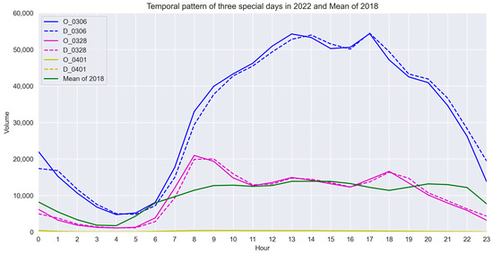Temporal pattern of the volume of online car-hailing trips of the three special days in 2022, and the mean of 2018.