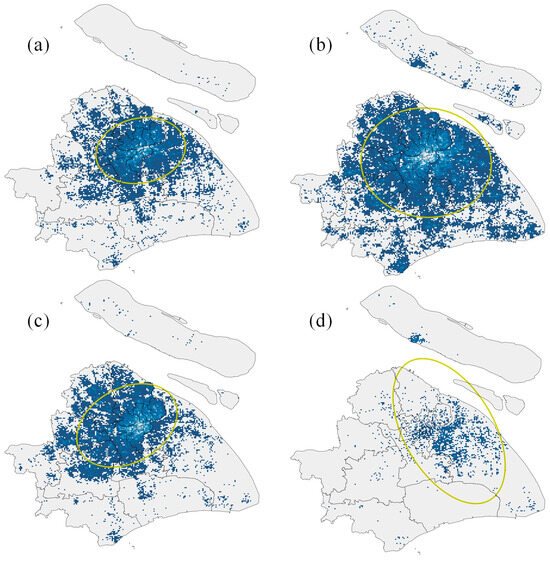 What is more, the method of the standard deviation ellipse was applied to measure the direction distribution of the spatial pattern. We used the origins for calculation. The results for spatial point analysis are displayed in the same graph. As shown in Figure 6, the major axis of the standard deviation ellipse depicts the direction of the data distribution, and the ellipse covers approximately 99.7% of the sample points. The oblateness was introduced to denote the directionality of the data, which is calculated as the ratio of the major axis minus the minor axis to the major axis. The oblateness ranges from 0 to 1 and the greater the value, the more obvious the directionality. We observed that in the normal time in 2022 (Figure 6b), the direction turned northwest–southeast compared with that in 2018. This is mainly because of the rapid development in Pudong New District including regions of Zhangjiang, and Chuangsha, which is consistent with the government planning of Shanghai. Until now, an east–west urban development belt along the Yan’an Road-Century Avenue has been formed in Shanghai. In addition, the coverage of the ellipse on 28 March 2022 grows larger, resulting from the greater quantity and span of online car-hailing trips. On the first day of the lockdown in Pudong (Figure 6c), the majority of the trips remained in Puxi and a traditional gathering of trips appeared along the Yan’an Road, accounting for the northeast–southwest direction and a compact ellipse. Meanwhile, on 1 April (Figure 6d), a large proportion of travel was restricted, leaving a small portion in Pudong and Chongming districts. Its standard deviation ellipse was generated as shown in the graph.