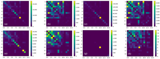 The flows between administrative districts were calculated and the 16-by-16 matrix was generated for each day. Figure 7a,b, Figure 7c,d, Figure 7e,f, and Figure 7g,h show the flows between administrative districts in 2018, and 6 March, 28 March, and 1 April 2022, respectively. As shown in Figure 7a,c,e,g, the values on the diagonal of the matrix make up the majority, namely the diagonally dominant. Pudong and Minhang Districts are the top two in terms of the amount of travel, where the Hongqiao Transportation Hub and the Pudong International Airport are located, respectively. The trips of car-hailing within the administrative districts are the majority. To better display the number of trips between the boroughs, the diagonal elements were set to zero (Figure 7b,d,f,h). The districts numbered from 0 to 8 and 10 account for the vast majority of the trips, corresponding to the districts with the intersection of the central area of Shanghai.