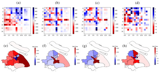 Furthermore, the net flows between the administrative districts were also studied and visualized. The matrix of net flows is derived from the flow matrix minus its transposition. As a result, the net flow matrix is the skew-symmetric matrix (see Section 4.2 for more details). In terms of visualization, the color blue (for the positive value) denotes the net outflow, while red (for the negative value) denotes the net inflow. For instance, as shown in Figure 8a, the net flow from districts 0 to 10 is positive with the color of blue, which means there is a net outflow for district No. 0 from districts 0 to 10. On the contrary, there is a net inflow for district No. 10 from districts 10 to 0, with the red color and the negative value. Figure 8 presents the net flows in 2018 and the three days in 2022. There is an obvious difference between the patterns of net flow over the two years. In 2018, the upper triangle of the matrix of net flow is almost positive with the color of blue, while the lower triangle is almost negative and red. In 2022, the pattern is different and not so regular. On 6 and 28 March 2022, Minhang District is an inflow from any other district, showing all red with negative values in the line of No. 7. On 1 April, the pattern becomes irregular due to the special crowd behaviors as well as the stochastic results.