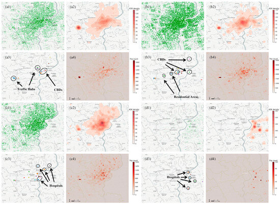 Result of multi-perspective analysis. (a1) Scatter diagram in 2018; (a2) KDE plot in 2018; (a3) hotspots discovered from DBSCAN in 2018; (a4) raster analysis plot in 2018; (b1) scatter diagram on 6 March 2022; (b2) KDE plot on 6 March 2022; (b3) hotspots discovered from DBSCAN on 6 March 2022; (b4) raster analysis plot on 6 March 2022; (c1) scatter diagram on 28 March 2022; (c2) KDE plot on 28 March 2022; (c3) hotspots discovered from DBSCAN on 28 March 2022; (c4) raster analysis plot on 28 March 2022; (d1) scatter diagram on 1 April 2022; (d2) KDE plot on 1 April 2022; (d3) hotspots discovered from DBSCAN on 1 April 2022; (d4) raster analysis plot on 1 April 2022.