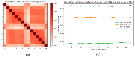 Result of correlation analysis. (a) Spearman’s rank correlation coefficient of ride counts between 15 days in 2018; (b) Spearman’s rank correlation coefficient of ride counts between the three days in 2022 and 2018.