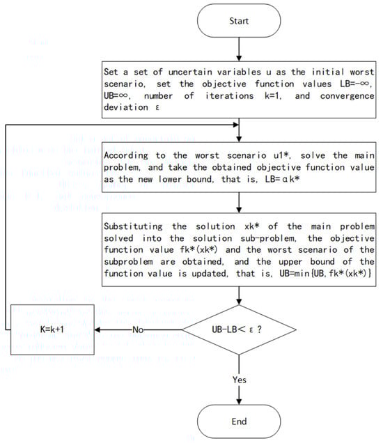 After the above derivation and transformation, the two-stage robust model is finally decoupled into the main problem Equation (30) and sub-problem Equation (33) with a mixed-integer linear form, which can then be solved using the C&CG algorithm, and the flow is shown in Figure 1.