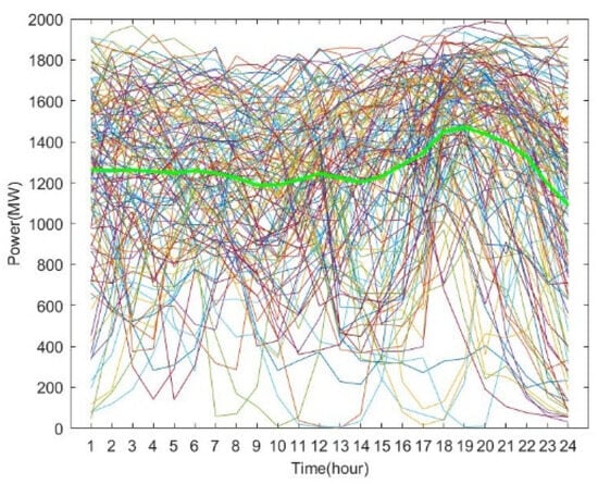 where is a certain prediction scenario; is the set of all prediction scenarios; wT(s) denotes the superimposed power value of wind and PV in the t-th time period under scenario ; and are the wind and PV power in the t-th time period under scenario , respectively; and is the value of the flexibility time scale.
