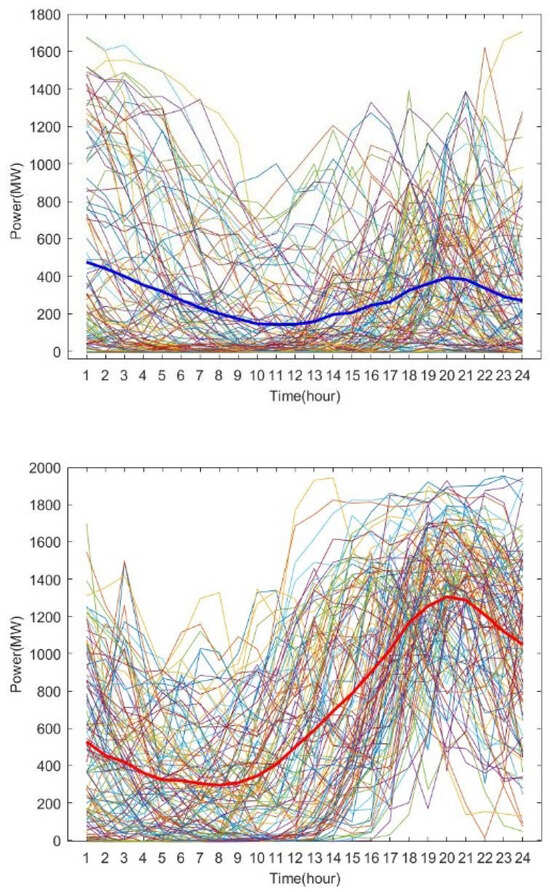 where and denote the predicted values of PV output and load power in section t, respectively; denotes the predicted aggregated power value of the combined wind and PV outputs at moment t; and is the fluctuation value of the wind and solar outputs introduced by considering the uncertainty [].