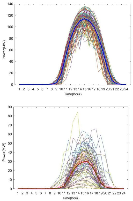 The typical scenario reduction method involves generating typical scenarios that can be used for the scheduling optimization of a combined power plant system of new energy and energy storage by analyzing and processing new energy data in a combined power plant system of new energy and energy storage. For example, for the typical scenario of PV output in a combined power plant system of new energy and energy storage, the typical scenario reduction method reduces and recreates the scenarios with the help of the basic unit of clustering with the unit of days. If the total number of the original PV output scenarios is M, each day’s PV data are regarded as scenario m (m = 1, 2, … M), and each scenario m contains the PV output data of T time points, it is possible to use an M × T scenario to describe the output scene. Therefore, the entire PV output scene can be described with the help of an M × T order matrix. Based on the clustering algorithm, all the initial scene data are compared and analyzed, the initial M scene data are merged and finally reduced to obtain K scenes, a K × T order matrix is used to describe the typical PV scenes, and there are Nk initial scenes in the kth typical scene. With the help of the typical scene reduction method, the aim of reducing the number of scenes is achieved, and the timing of the typical initial data is not changed at the same time due to the fact that the timing of the data at T time points within the scene is not changed.