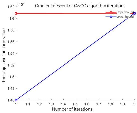 Convergence curves of the UB and LB in the iterative process of the C&CG algorithm.
