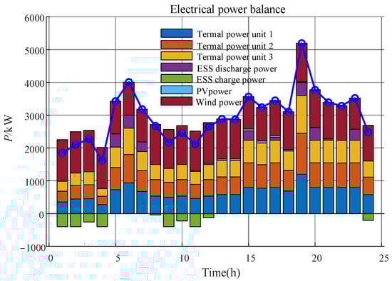 The final scheduling optimization results for each unit under the robust scheduling rule are shown in Figure 7. Among them, for the charging and discharging power of energy storage, the negative half-axis in the figure indicates that the energy storage is in a charging state, and the positive half-axis indicates that the energy storage is in a discharging state, which demonstrates that the energy storage unit is charged during the period with a low price of electricity and discharged during the period of the peak load or the peak price of electricity, so as to play the role of shaving peaks and filling valleys and balancing the power generation and consumption.
