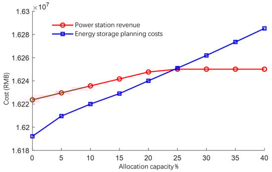 By changing the configuration of the storage capacity, from 0% and gradually increasing to 40%, we obtain the power station revenue and energy storage cost curve, as shown in Figure 8, where the new energy feed-in power × new energy feed-in tariff = power station revenue. In the allocation of storage, the power station revenue is reduced as the allocation of the storage capacity increases, and it increases when the allocation of the storage capacity reaches a certain level. Robust scenarios of wind power consumption tend to be saturated, and the power station revenue increase is no longer obvious, while the cost of energy storage planning with the increase in storage capacity monotonically increases. The two lines intersect at one point, and after the intersection point, the cost of energy storage planning will exceed the power station revenue, and the economic benefit enhancement brought about by energy storage planning will disappear. Therefore, in Figure 8, the intersection of the two lines will be recorded as the optimal allocation capacity of energy storage; at this time, the allocated storage capacity of about 25%, and the power plant revenue is 16.25 million yuan.