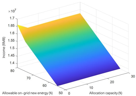 In order to study the impact of grid-allowed new energy feed-in power on the revenue of new energy power plants and to compare it with the impact of the distribution storage capacity on the revenue of power plants at the same time, in this paper, the amount of new energy allowed to be fed into the grid from 55% to 80% is varied, i.e., the value of x obtained in Section 2 is varied. And at the same time, the distribution and storage capacity in increments from 0% to 30% is also varied. Then, the combinatorial schemes corresponding to these ratios are solved based on the robust modeling. Finally, calculating the power plant revenue under the scenario corresponding to the rationing combination based on the power plant revenue equation proposed above, the evolution curve is obtained as shown in Figure 9.