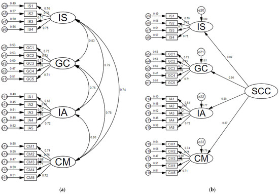 We utilized Cronbach’s α value to assess the questionnaire’s reliability. Generally, a Cronbach’s α below 0.65 is considered unacceptable, while a value above 0.85 indicates very high reliability of the questionnaire [70]. Following the principle of enhancing scale reliability, we eliminated items with poor Cronbach’s α or those that negatively impacted their main factor’s Cronbach’s α [71]. Fortunately, we found that Cronbach’s α value for all factors and items exceeded 0.7, demonstrating a high level of scale reliability. However, we identified that item IS5 had a detrimental impact on its main factor, SCC, and thus should be removed.