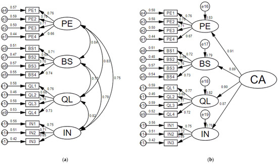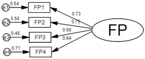 In the realm of depicted relationships, as illustrated in Figure 2a, the path coefficient among the four principal factors surpasses 0.7, underscoring the existence of a higher-order dimension that encapsulates the overarching attributes of these four indicators. Figure 2b shows this higher-order dimension, termed SCC. Analogously, in Figure 3a, the path coefficient linking the four key factors exceeds 0.75, leading us to label this overarching dimension as CA in Figure 3b. Likewise, in Figure 4, the manifestation of FP is evident, with factor loadings surpassing 0.7, signifying the robust coherence of this construct.