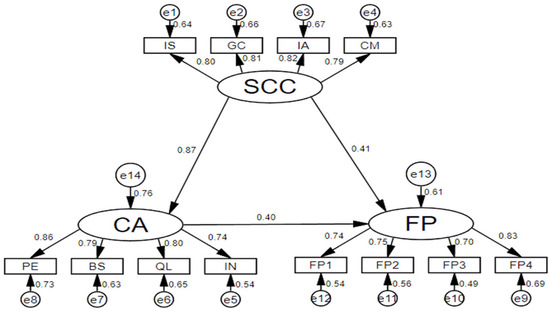 Collectively, the outcomes of the model fit analysis affirm the robust convergence efficiency of the data, as presented in Table 11. For the first-order model of SCC, the indices are as follows: χ2/df = 2.217, RMSEA = 0.062, GFI = 0.908, CFI = 0.939, NFI = 0.895, and AGFI = 0.880. Moving to the second-order model, the fit indices are χ2/df = 2.236, RMSEA = 0.062, GFI = 0.906, CFI = 0.937, NFI = 0.892, and AGFI = 0.880. Similarly, in the context of CA, the fit indices for the first-order structure are χ2/df = 2.015, RMSEA = 0.056, GFI = 0.932, CFI = 0.961, NFI = 0.927, and AGFI = 0.903. Likewise, for the second-order structure of CA, the fit indices are χ2/df = 2.069, RMSEA = 0.058, GFI = 0.929, CFI = 0.958, NFI = 0.923, and AGFI = 0.901. The model of FP also demonstrates consistent fit, with indices as follows: χ2/df = 1.001, RMSEA = 0.002, GFI = 0.997, CFI = 1.000, NFI = 0.996, and AGFI = 0.984.