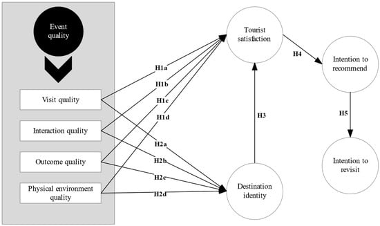 Additionally, physical environment quality relates to the convenience, organization, and services an event venue provides [28]. Physical environment quality includes a comfortable and inviting venue, a practical layout, high-quality audio–visual equipment, appropriate temperature and lighting, and food and beverage services [29]. Visitors will feel more at ease and cared for at museums that host events in well-designed spaces with the appropriate amenities and facilities, thereby increasing their satisfaction [27]. For example, an event with spacious rooms, advanced audio–visual equipment, comfortable seating, and refreshments will have a high-quality physical environment [28]. In conclusion, the quality of the visit, the quality of the interaction, the quality of the outcome, and the quality of the physical environment shape museum event experiences that appeal to tourists and meet their needs and expectations [29]. When these characteristics are high, visitors will be profoundly satisfied and perceive the event as having enduring meaning, purpose, and value [30]. This demonstrates that event quality significantly impacts visitor satisfaction [27]. Based on the arguments, we hypothesize that: