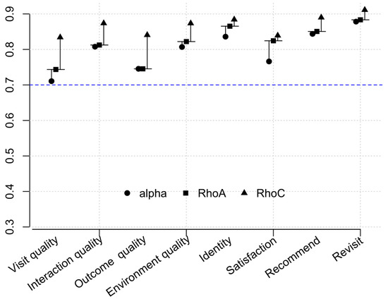 Results of the reliability indicators of the used constructs. The blue dashed line represents the 0.7 threshold above which reliability indicators are valid.