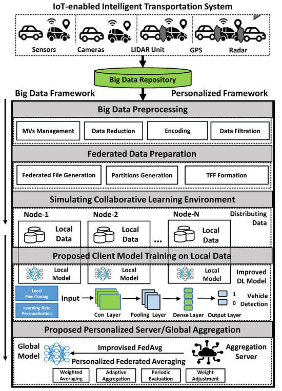 Our proposed architecture is designed to seamlessly equip Big Data analytics with FL in an IoT-enabled ITS. The proposed approach is a personalized FL approach used to tailor the global aggregation and averaging for improved performance. Various personalization methods are utilized to enhance the Federated Averaging (FedAvg) algorithm. Local fine-tuning and weighted averaging tailor the global model to individual client data. Custom learning rates are utilized to boost the performance further. Regular evaluations are advised to maintain model efficacy. Overall, these approaches offer a robust strategy for personalizing FedAvg. The architecture comprises five major modules or layers, each addressing specific requirements to ensure robust, real-time analytics while preserving user privacy. The architecture leverages ensemble techniques to enhance model performance. The proposed model is depicted in