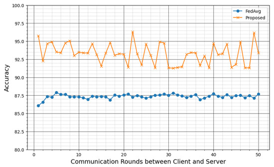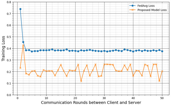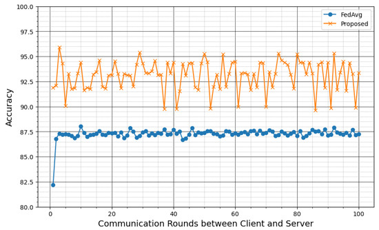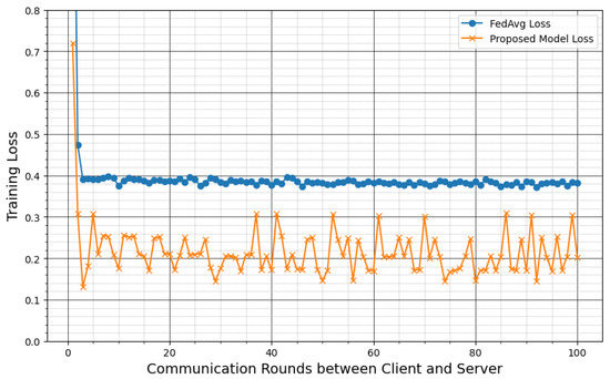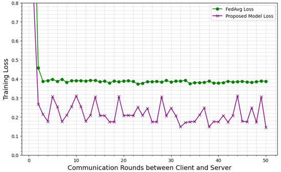 The proposed model shows more pronounced fluctuations in loss and accuracy after convergence compared to the standard FedAvg. This is because of the following factors: