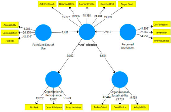 To establish the strength and significance of the relationships between the variables under investigation, the study employs structural equation modeling (SEM). SEM is a robust statistical method that can analyze complex relationships among multiple variables simultaneously. The research results were obtained through the application of SmartPLS software, which is a powerful tool for conducting structural equation modeling. The software enabled the researchers to analyze the data and assess the research factors, providing a reliable framework for drawing meaningful conclusions. Using SmartPLS software, which enables the modeling of structural equations in partial least squares variance, the conceptual model was put to use and tested. The test analysis in this study involves 5 latent variables. The variables of perceived ease of use, perceived usefulness, and MATs’ adoption are defined as exogenous variables, while organizational performance and organizational sustainability are endogenous variables. In this case, the MATs’ adoption variable is also used as a mediator variable. Furthermore, the indicators used in measuring latent variables include: perceived ease of use (customization, accessibility, rapidity); perceived usefulness (innovativeness, information, cost-effectiveness); MATs’ adoption (balanced scorecard, activity-based costing, target cost, lifecycle cost, economic value added); organizational performance (financial performance, operational efficiency, and organization’s strategic initiatives); organizational sustainability (technology orientation, cost-centric orientation, and adaptability).