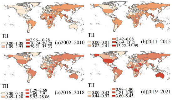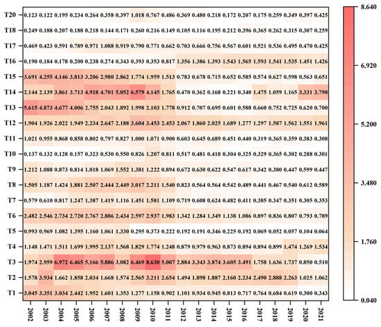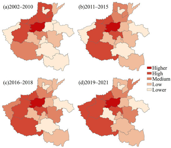 - The overall size of Henan Province’s foreign trade grew, rising from USD 3.7 billion to USD 127 billion. The trade pattern, on the other hand, shows more obvious spatial and temporal heterogeneity, which can be divided into a starting period (2002–2010), a rapid development period (2011–2015), a period of stable growth (2016–2018), and a period of restored growth (2019–2021). In addition, significant spatial heterogeneity exists in the distribution of foreign trade within Henan.