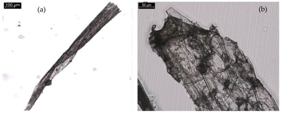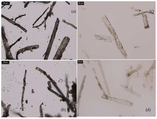 In this part of the work, we investigated and characterized the fibers of the original biomass and the pulp obtained after delignification using different analyses. First, we observed the fibers using optical microscopy to better understand and observe the change in their character. We observed each sample at three magnifications, and our goal was to see the character and shape of each fiber as we observed it. In Figure 1, the character of the fibers of the original biomass can be seen. These fibers are relatively smooth, without any distinct protrusions. It can also be seen that they are relatively longer than the fibers obtained after delignification (Figure 2).