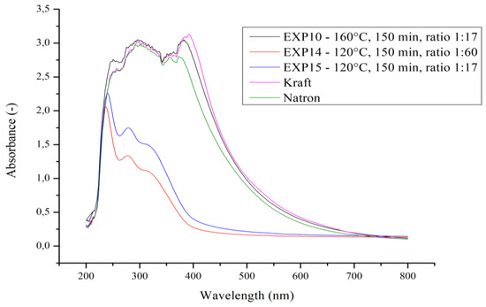 Another analysis to characterize the obtained pulps was UV–Vis spectroscopy where we spectrophotometrically determined brown fragments on the fiber surface. The obtained dependence of absorbance on wavelength is shown in Figure 3, and we used the OriginPro 8.5 program for the evaluation. The lowest absorbance was obtained for sample 14, characterized by the lowest percentage of lignin with an absorbance value of 2.03 at a wavelength of 240 nm. In contrast, sample 10 with the highest percent lignin has an absorbance value as high as 2.72 at 245 nm. The highest absorbance values for all three samples are between 240 and 300 nm. This confirms the presence of lignin in the solution and hence on the original samples, since the absorption bands centered at 280 nm are attributed to lignin [15]. As a reference sample, we chose lignin obtained by the natron and sulfate methods. Comparing the reference samples with our samples, we see that sample 10 is almost identical to the reference samples. This proves our hypothesis that the brown fragments from the fiber surface are indeed lignin.