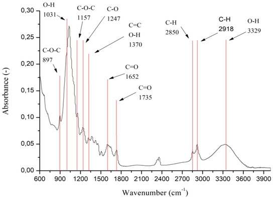 After characterizing the samples using UV–Vis analysis, we used FT-IR analysis. It is known from the literature that FT-IR is an important technique in the analysis of biomass and its structure, and subsequently in the characterization of changes in the structure of lignocellulosic materials as a result of various chemical and physical treatments. Pawlak-Kruzcek et al. [16] summarized the FT-IR bands and maximum values that were identified in various studies dealing with biomass and characterization of its structure. We used the obtained spectra to characterize the fibers in terms of changes in the functional groups of lignin, cellulose, and hemicelluloses after delignification. In Figure 4, we displayed the obtained spectrum for our raw biomass—wheat straw. The area between 3100 and 3500 cm−1 is due to the stretching of hydroxyl groups in holocellulose and lignin. Value 897 cm−1 corresponds to β-glycosidic bonds in cellulose, which can be proven presence of increased cellulose content in samples after delignification [15,16,17,18,19]. As it increases absorbance value at a wavelength of 897 cm−1, thereby increasing the cellulose content in the sample. Values 1380 and 1320 cm−1 correspond to the C=C bonds of the aromatic nucleus in lignin. Peaks at 1714 and 1654 cm−1 correspond to conjugated and unconjugated carbonyl bonds. The stretching of the aromatic core in lignin is observed at peaks with the value 1595 and 1510 cm−1. These signals describe the aromatic vibrations characteristic of lignin syringyl and guaiacyl type [18,19].