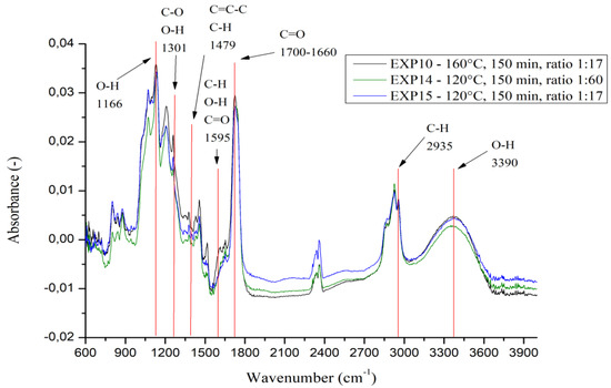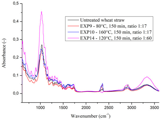 The comparison of samples 9 and 10 with the raw biomass is worth paying attention to. Sample 10 has almost the same absorbance values and sample 9 shows even lower absorbance values either at the values for lignin or cellulose. These two samples are characterized by temperature boundary parameters, where in the case of sample 9, we used a temperature of 80 °C, and for sample 10 a temperature of up to 160 °C. Comparing samples 10 and 14, for which we obtained the lowest and highest cellulose content, we see a clear difference in the peaks corresponding to cellulose. Sample 10 achieves an absorbance of only 0.27 and sample 14 achieves absorbance values up to 0.46 at a wavelength of 1055 cm−1 (Figure 5).