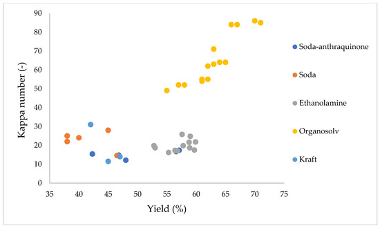 The aim of delignification is to obtain the smallest possible Kappa number, since this number represents the amount of lignin removed. The soda, Kraft, and soda-anthraquinone processes give us approximately the same Kappa numbers at yields ranging from 38 to 57.1%. For example, compared to soda process, we see that delignification with ethanolamine yields approximately the same pulp Kappa number, but their yields are significantly different. For the soda process, the yields are approximately between 38 and 46.5%, and with ethanolamine the yields are as high as 52.8–59.7%. Saberikah et al. in 2011 [22] delignified wheat straw with aqueous glycerol solution at different times. The pulp obtained in this way reached a Kappa number of 49–86, which is higher than that of other methods. At the same time, using the organosolv process, the highest yields were obtained, ranging between 55 and 70%. As can be seen from Figure 6, the results obtained in the delignification of wheat straw depend not only on the nature of the fibers used, but also on the type of process used, time, temperature, or the presence of a catalyst.