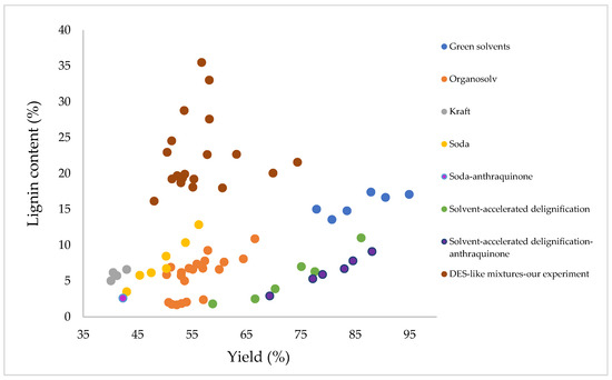 The next step was to conduct a literature search in terms of the resulting lignin content in wheat straw after delignification from yield using different solvents. Contents of lignin as well as yields differ when different delignification solvents are used, as can be seen on Figure 8. Yields range from 40.1 to 94.93% and lignin content ranges from 1.66 to 17.4%. The lowest lignin contents are achieved with organosolv delignification, ASD (solvent-accelerated delignification) and ASD-anthraquinone by delignification or when using soda and soda-anthraquinone process. In 2007, Ziaie-Shirkolaee et al. [24] obtained pulp after delignification by the Kraft process with a yield of 40.5–43% at a lignin content of only 5.01–6.6%. In contrast, pulp was obtained during delignification using the organosolv method with a yield of up to 50.33–66.56%, but with a higher lignin content, which was in the range of 5.01–10.88% [24]. Similarly, the addition of anthraquinone to the solvent affects lignin content, with lower lignin content achieved in its presence.