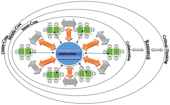 The SP-STEAM Model also has a progressive dimension, which refers to the gradual tracking of each person’s performance upon a dedicated scale. For each child, a detailed 10-point dichotomous scale performance tracker was developed. As discussed in length across the following sections of this manuscript, a detailed in-service education was provided to teachers in utilizing this assessment tool. As detailed further, teachers, the applicators of any given school of thought, need to be in a constant state of development in order to keep themselves fresh [32]. For each subject matter and unit in mathematics, this tool was used as supplementary material to guide teachers in the process. Teachers obtained opportunities to guide children’s learning, especially where they noticed any obstacles, misconceptions, and struggles, that could possibly be experienced by the children. With these means, the children were expected to self-screen their improvements while simultaneously gaining confidence in scientific thinking. On the other hand, it is believed that the teachers would better monitor children’s improvements, and provide better feedback in turn. This cyclic progressive approach would enable children to build experience upon experience, finding opportunities to practice and gain a scientific thinking culture. The classroom atmosphere was designed for the experiment groups; thus, student-student, student-teacher, group-group, and group-teacher interactions were enhanced. In the promotion of problem-solving, research-based collaborative techniques were expected to be used by the teachers, in turn establishing an expectancy for the students to practice critical thinking. The detailed schematic expression of such a classroom atmosphere is mimicked in Figure 1 below.