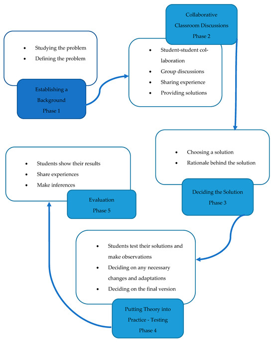 The teacher training program was developed and carried out by two independent teacher trainers, who were appointed by the North Cyprus Ministry of Education for a European Union project, and have more than 10 years experience in providing in-service teacher training for primary school teachers. After obtaining their consent to participate in this study as teacher trainers, the researchers met with the trainers several times, negotiating the expected outcomes of the experiment. As a result of the meetings, a consensus upon the aim and expected outcomes of the teacher training program were reached. Accordingly, the teachers within the experiment groups would be trained in terms of methodology, the materials, and technology they would use during their instructions. The experimental group teachers were informed about the application of problem-solving-based teaching methods and collaboration in teaching mathematics. The training lasted for 5 weeks and included workshops, where teachers practiced linking every subject matter to real life situations, and produced materials for learners to solve mathematic problems. As asserted by several researchers, learning mathematics is more meaningful and interesting if problems are linked to children’s living quarters, establishing more enjoyable problem solving [12,14]. For this reason, the first and an important facet of the teacher training program, was that teachers were trained to produce examples and activities enjoyable for the learners, so that the problem solving process would be more interesting and appealing. The second facet of the teacher training program was to help teachers create lesson plans to cover the expected outcomes. The lessons were expected to be designed in a way that would enable both the teachers and the students to practice their thinking skills and subject maters in a systematic way. A five phase systematic teaching approach has been developed and introduced to teachers via training and workshops. This five phase systematic teaching approach developed for embedding the SP-STEAM model, is explained in detail in Section 3.3 below.