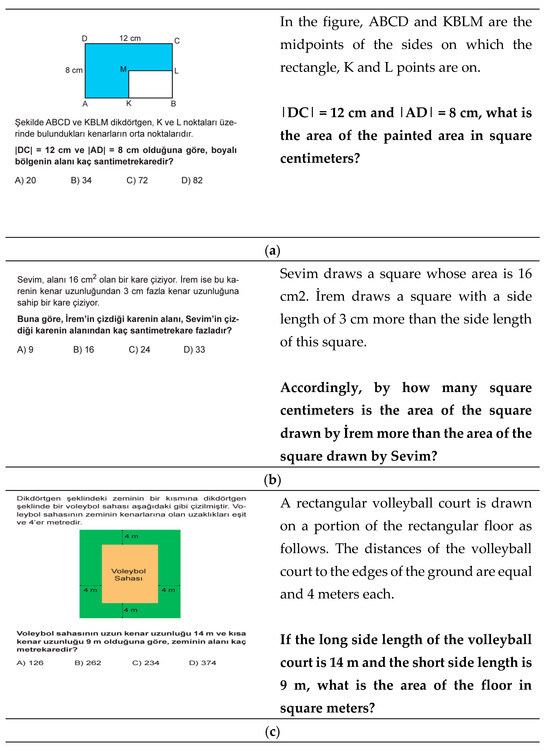 Sample Questions of the Mathematics Achievement Test. (a): Sample Question about Measurement; (b): Sample Question about Areas; (c): Sample Question about Geometric Illustrations.