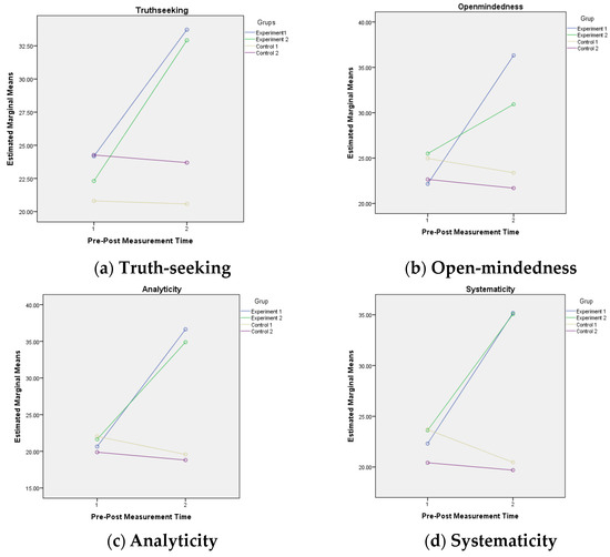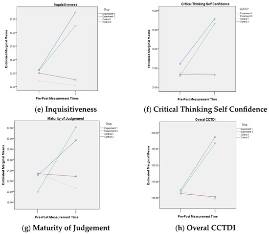 When the F test results were interpreted with Tukey group-wise comparison results, it is clear that the SP-STEAM program made a considerable difference in the CTDs of 5th-grade primary school students. Profile plots also showed the intercepts for better visual interpretation of the results since interpreting split-plot ANOVA results is complicated (see Figure 4 for profile plots for each facet of the CCTDI across pre-post-test design for experiment and control groups below).